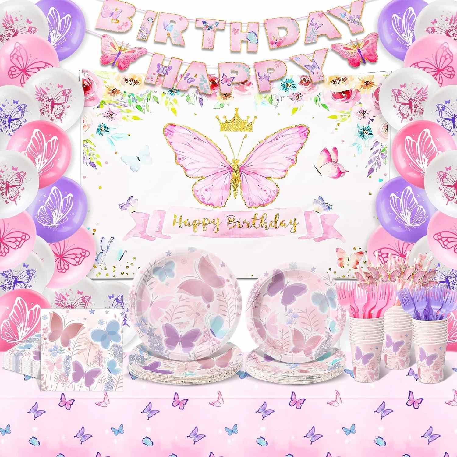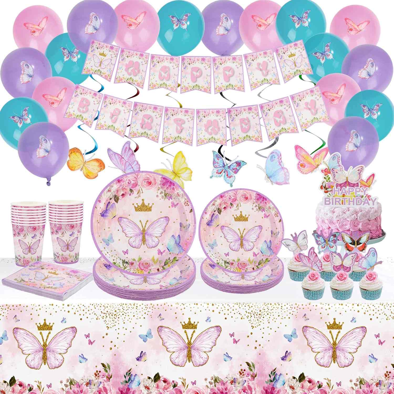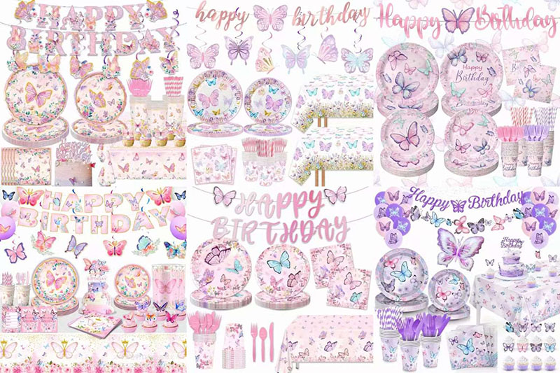 ການອອກແບບໃຊ້ຜີເສື້ອທີ່ມີສີສັນເປັນພາກສ່ວນຕົ້ນຕໍ. ມັນປະສົມກັບດອກໄມ້ແລະຂີ້ຝຸ່ນເຫຼື້ອມ. ສີແມ່ນສົດໃສແລະມີຫຼາຍແບບ. ມີໂຕນສີຂຽວ, ໂຕນສີບົວແລະສີມ່ວງ, ແລະກຸຫລາບທີ່ມີສຽງ. ຮູບຮ່າງຂອງຕົວຫນັງສືເບິ່ງທີ່ພິເສດ. ພວກມັນສາມາດກົງກັບຫມວກ butterfly ຫຼື butterflies ກ້ຽວວຽນ. ການເບິ່ງທັງຫມົດຮູ້ສຶກເຕັມທີ່ແລະອຸດົມສົມບູນ. ປ້າຍໂຄສະນາຕົວອັກສອນສີບົວແລະສີມ່ວງແລະສີບົວທີ່ມີຜີເສື້ອ 3D ແລະໂບອ່ອນສາມາດແຂວນໃສ່ຝາຫຼືເພດານ. ມັນເຮັດໃຫ້ມີແສງສະຫວ່າງງານລ້ຽງໄດ້ໄວແລະເຮັດໃຫ້ຄໍາເວົ້າ "ສຸກສັນວັນເກີດ" ຄືກັນກັບພວກມັນເປີດລະຫວ່າງປີກຜີເສື້ອ.