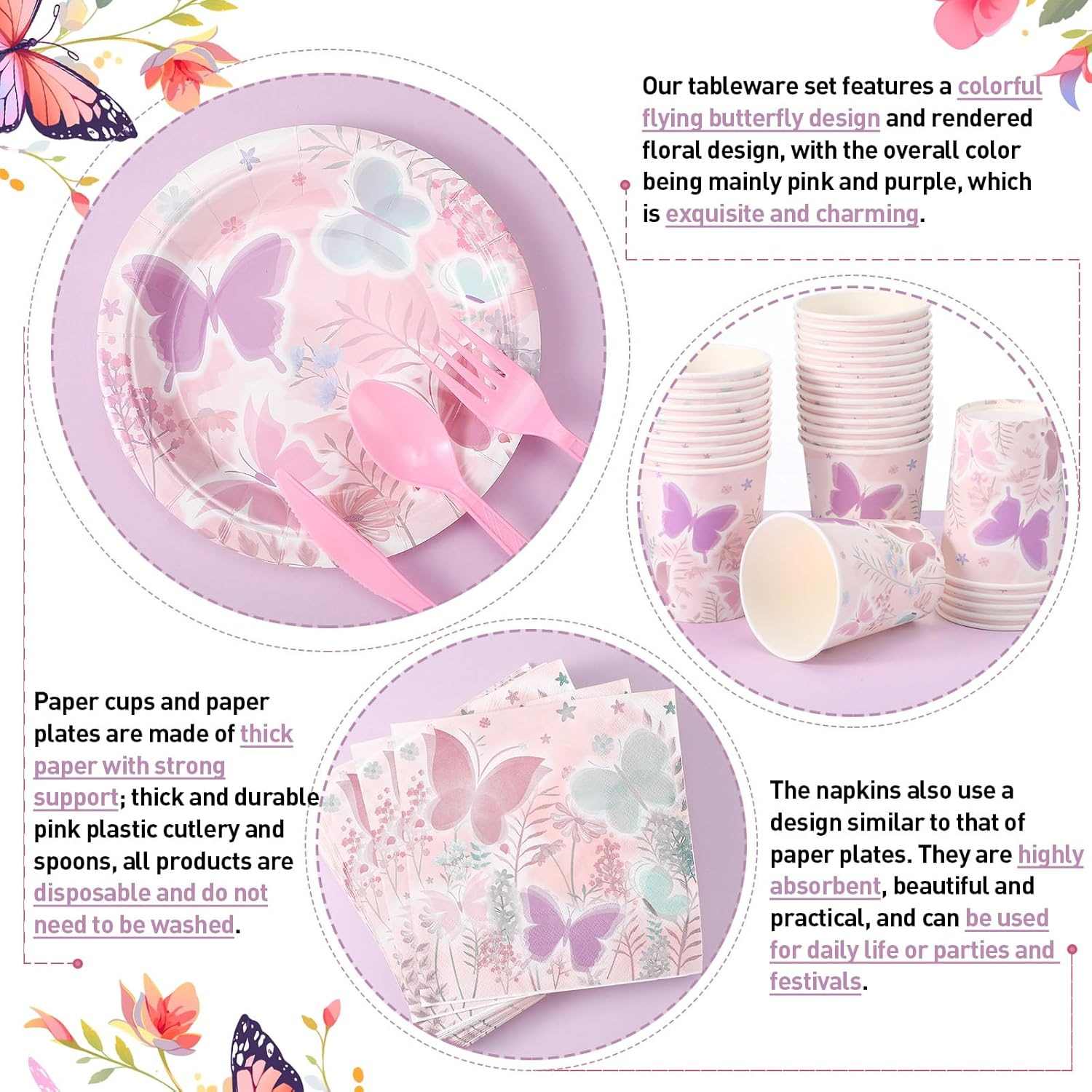 ການແກ້ໄຂບັນຫາທີ່ກໍາຫນົດເອງແມ່ນປ່ຽນແປງໄດ້. ຈໍານວນຊຸດຂອງຕາຕະລາງສາມາດປ່ຽນແປງໄດ້ໂດຍຂະຫນາດຂອງພັກ. ແບບຮູບແບບສາມາດປ່ຽນແປງໄດ້ເຊັ່ນກັນ. ມັນສາມາດສະແດງຫົວຂໍ້ທີ່ແຕກຕ່າງກັນຫຼືກາຕູນທີ່ຫນ້າຮັກເບິ່ງ. ຂໍ້ຄວາມສາມາດເພີ່ມເຂົ້າໄດ້, ເຊັ່ນຊື່ຫລືສັນຍານງານລ້ຽງຕ່າງໆ. ຊຸດເຄື່ອງແທັບເລັດ Butterfly ແຕ່ລະຮູບເບິ່ງເປັນພິເສດແລະຮັກສາຄວາມຊົງຈໍາສໍາລັບງານລ້ຽງ.