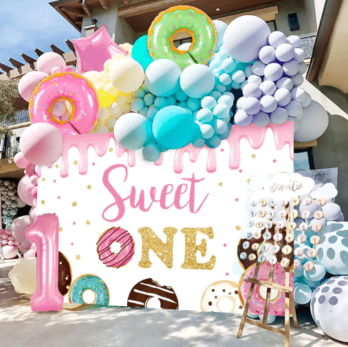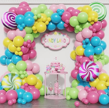 ຊຸດເຂົ້າໜົມປູມເປົ້າ garland ຫົວຂໍ້ທີ່ມີສີເຂົ້າຫນົມຫວານຝັນຫວານແລະຮູບຮ່າງ lollipop ງາມເປັນອົງປະກອບອອກແບບຫຼັກ, ຮູບແບບໂດຍລວມແມ່ນມີຊີວິດຊີວາແລະຫວານ.