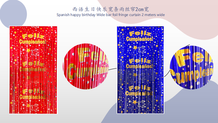 ເຊັ່ນ: ຜ້າມ່ານ foil ກັບຫົວຂໍ້ຂອງສີທຸງຊາດ, ເຊິ່ງສາມາດໃຊ້ສໍາລັບກິດຈະກໍາຮັກຊາດເຊັ່ນ: ວັນຊາດ; ມັນຍັງມີສີດໍາແລະສີຂາວ foil cashat ກັບຫົວຂໍ້ການແຂ່ງຂັນ, ເຊິ່ງເຫມາະສໍາລັບງານລ້ຽງຫົວຂໍ້ການແຂ່ງ, ແລະອື່ນໆ.