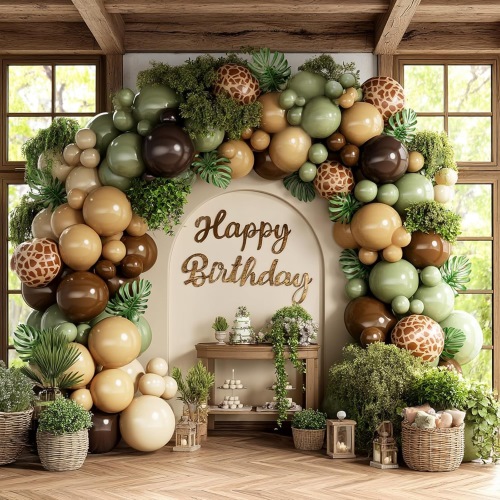 Safari Balloon Arch ມີອົງປະກອບຫຼັກຂອງຮູບແບບປ່າໄມ້. ປູມເປົ້າສີນ້ຳຕານເປັນຕົວແທນຂອງລຳຕົ້ນ, ປູມເປົ້າສີຂຽວເປັນສັນຍາລັກຂອງໃບ, ແລະປູມເປົ້າທີ່ພິມອອກຫຼາກຫຼາຍຊະນິດພັນລະນາເຖິງສັດຕ່າງໆ, ສ້າງຄວາມຮູ້ສຶກຂອງການຈັດງານລ້ຽງໃນປ່າ. ມັນສ້າງສາກງານລ້ຽງທີ່ມີສະໄຕລ໌ ແລະ ບັນຍາກາດແບບບໍ່ຫຍຸ້ງຍາກ.