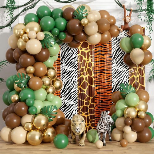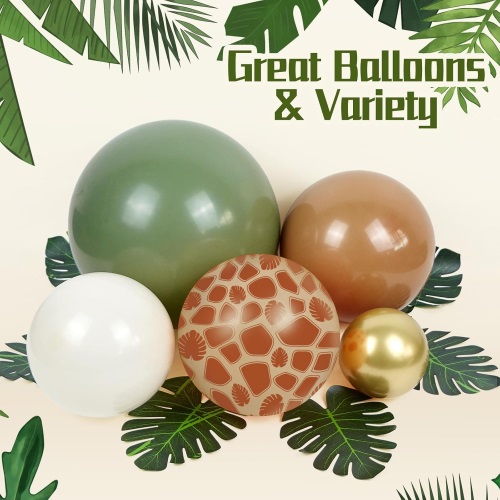 ມີປູມເປົ້າຢາງຫຼາຍກວ່າ 100pcs ຕໍ່ປະຕູບານ Safari. ມັນປະກອບມີປູມເປົ້າຢາງ 5inch, 10inch ແລະ 18inch, 5inch, 10inch and 18inch avocado green latex balloons, 5inch, 10inch ແລະ 18inch balloons brown latex balloons, 10inch sand white balloons, 10inch bean green balloons, 10inch tea latex balloons, ປູມເປົ້າຢາງພາລາ 12 ນິ້ວ, ປູມເປົ້າພິມ giraffe 12 ນິ້ວ, ປູມເປົ້າພິມເສືອ 12 ນິ້ວແລະອຸປະກອນເສີມປູມເປົ້າ.